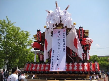 武庫川の土手のツツジが満開の中、第三回宝塚だんじりパレードに参加してきました。