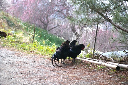 長鳴鶏が放し飼いにされています。