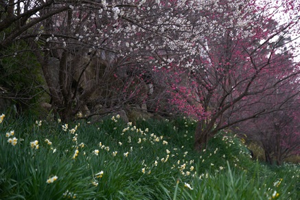 境内からは、大阪平野が見渡せ、高安山の斜面には水仙と梅が咲き、